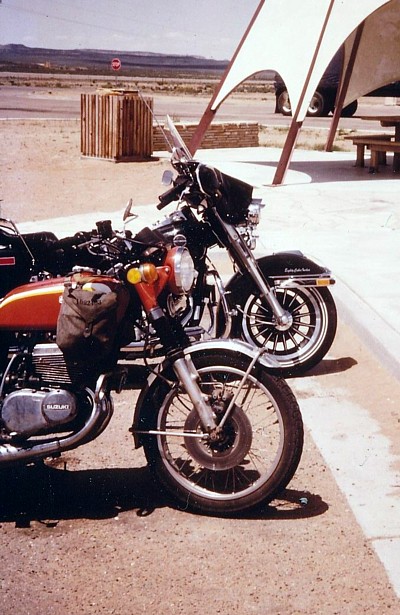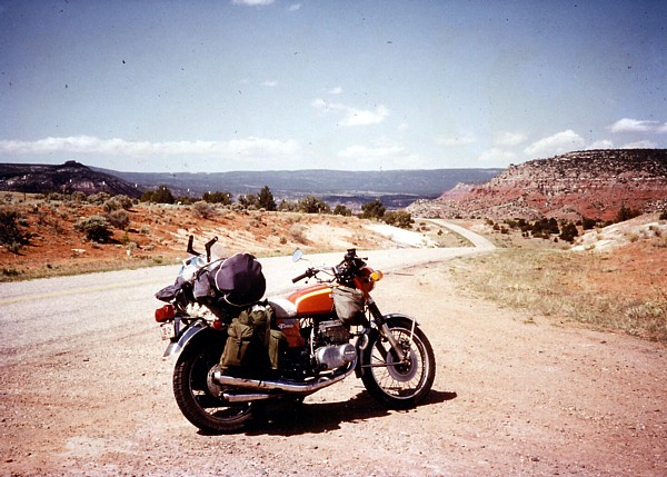 Next morning, going across northeastern New Mexico, I started having sporadic engine trouble: an occasional miss, difficult starting, now and then she'd lose a cylinder for a moment. Finally in Cimarron, before the mountains, I made a careful examination and found the problem: a cracked ignition terminal was shorting out the center plug. I wrapped it in friction tape for a temporary fix and later, after an exhilarating ride over a 9000-foot pass, picked up a replacement at a bike shop in Taos.