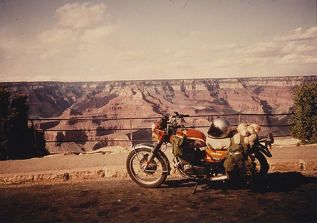 I'd never seen the Grand Canyon before, except once from the air. I stared dully at it for a few minutes, but I was too wiped out to have any particular feelings. Finally I started the Suzuki again and rode to the campground, where I was told I was just in time for the very last campsite they had open. The price was outrageous, but I didn't really care.