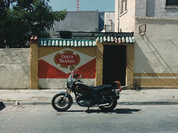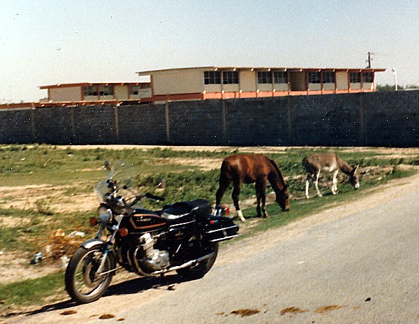 A desperate examination suggested that the problem was in the ignition switch, which had chosen this of all times to expire. While I was scratching my head and informing the 750 that I obscenitied in the milk of its ignition switch, a truck stopped and a couple of Mexican guys came to see what was going on. With a bit of wire they had in the truck, the three of us managed to hotwire the Honda so that I at least had power, though the headlight remained dark. I thanked them profusely and jammed hard up the highway, trying to beat nightfall; but it was dark by the time I pulled into Reynosa. I worried a little about getting stopped for not having a headlight, but then I saw a Mexican cop sitting on a motorcycle watching me, and his wasn't working either.
