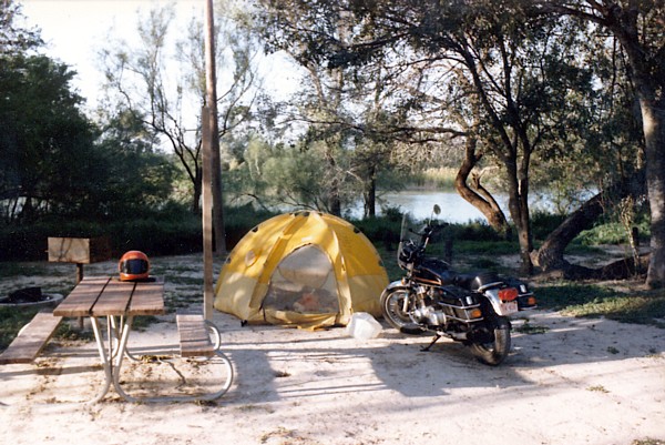 In the morning the rain had stopped but it was chilly and overcast and obviously getting ready to rain some more. The hell with this, I said to myself, I bet I know where it's warm and dry...and by afternoon I was rolling southward in bright sunlight across the south Texas plain, and at the end of the day I was setting up camp on the banks of the Rio Grande near McAllen.