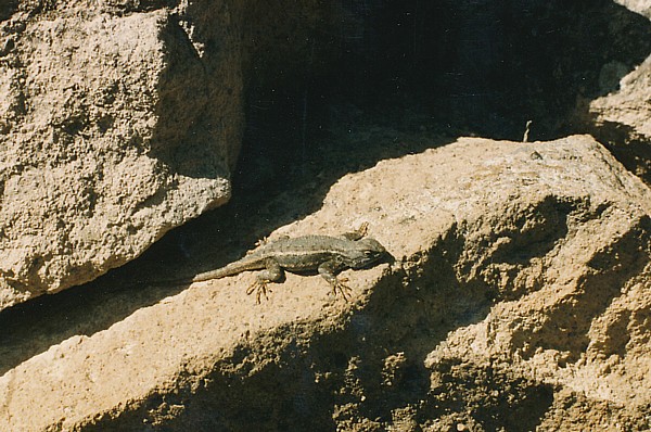 There was a trail of sorts up the side of the canyon and just for the hell of it I climbed it and looked around a bit. The view was spectacular but the Indian ruins shown on the map didn't live up to billing: just some loose piles of rocks out in the brush. On the way back down I met up with a local inhabitant whose family had been there a hell of a lot longer than any of us, but he didn't have much to say.