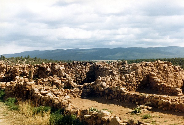 Nobody seems to know, but I think the place must have been an important religious center too. The ruins include some big kivas - sacred subterranean chambers, still seen in the traditional pueblos of today. A well-established and very ancient network of trails connected the numerous Indian towns that flourished in the Pajarito highlands around the same time as the European Middle Ages, and clearly the Bandelier community was a major nexus; and while trade would have been one reason, an important spiritual center would have brought in a lot of traffic too. On a hillside nearby is an ancient stone carving, supposed to have represented a pair of cougars but by now worn so smooth as to be almost unrecognizable; it is much older than the ruins on the valley floor, and must have been a sacred object of great veneration. (I saw it; I didn't touch it and I didn't photograph it. The damn thing made me nervous.)