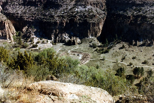 Bandelier - named for a 19th-century archaeologist - is a genuinely strange place. Down in Frijoles Canyon are the remains of what was obviously a large and thriving Indian community in pre-white times, some going as far back as the 12th century. For centuries an energetic and ingenious people farmed the valley floors and the plateau above, traded with other Indian communities - even the great civilizations of Mexico - grew and wove cotton, and generally had what must have been a pretty good life. Things had pretty much gone to hell by the time the Spanish predators showed up; the soil must have been used up over centuries of intensive farming within a small area, and warlike tribes had begun to move into the area. By the time the colonialists settled the area the canyon seems to have been pretty much abandoned.