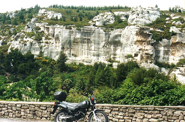 Up by Les Baux there were nice-looking houses off down in the gorge. There was a ruined medieval city or something of the sort at the top, but the place looked crowded and I was enjoying the ride too much to stop.