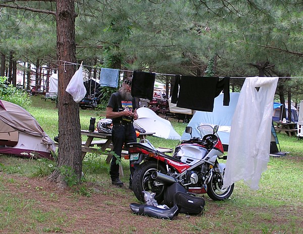 As you might have figured out from the backgrounds, "camping" has a considerable range of interpretations, with some favoring big, elaborate setups; in fact there are quite a few who pull small trailers behind their bikes, though personally I can't see it. (If I wanted more than two wheels I'd drive a car.)