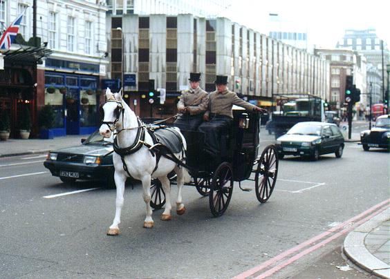 A beautiful horse-drawn carriage came rolling along Buckingham Palace Road and turned into the Royal Mews on some presumably royal business.