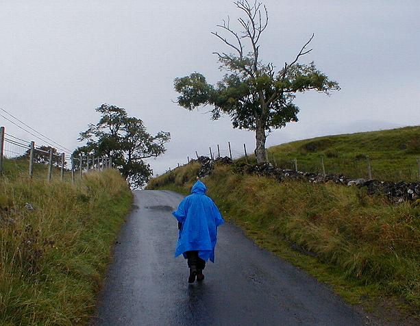 By now it had begun to rain in earnest. We broke out the plastic ponchos from Wal-Mart and slogged on. But gradually the rain grew heavier; we paused under a large but disappointingly leaky tree, discussed the matter, and turned back.