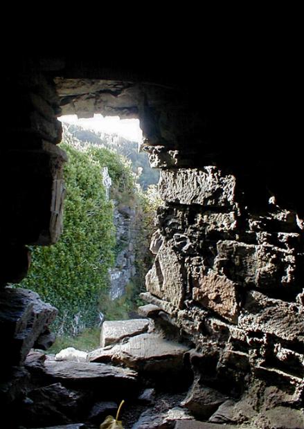 The access shaft to the upper part was still open. Phyllis wanted to go up. I told her over my dead body. So she killed me and we went anyway. It was a narrow little place, with a tightly coiled stairway of big stones, some of them broken or loose underfoot; the only light came from a kind of porthole (for archers?) halfway up.