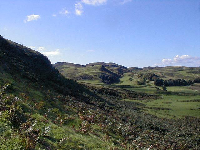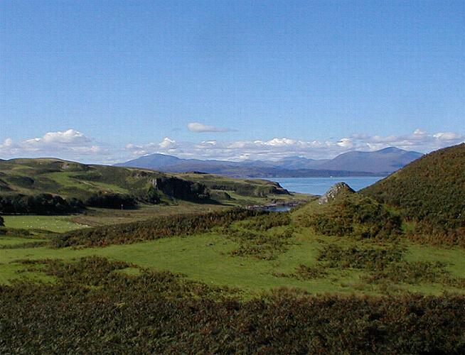 I scrambled back down the slope, somehow contriving not to fall on my ass, and joined her. We walked down to the shore and I got out the binoculars, but if any seals lived on those rocks they'd gone away for the weekend. We walked along the rocky shoreline a little way, picking up a few shells and watching the ravens wheeling over the hillsides; and finally, with profound regret, we turned and began the long walk back over the ridge to the ferry landing.
